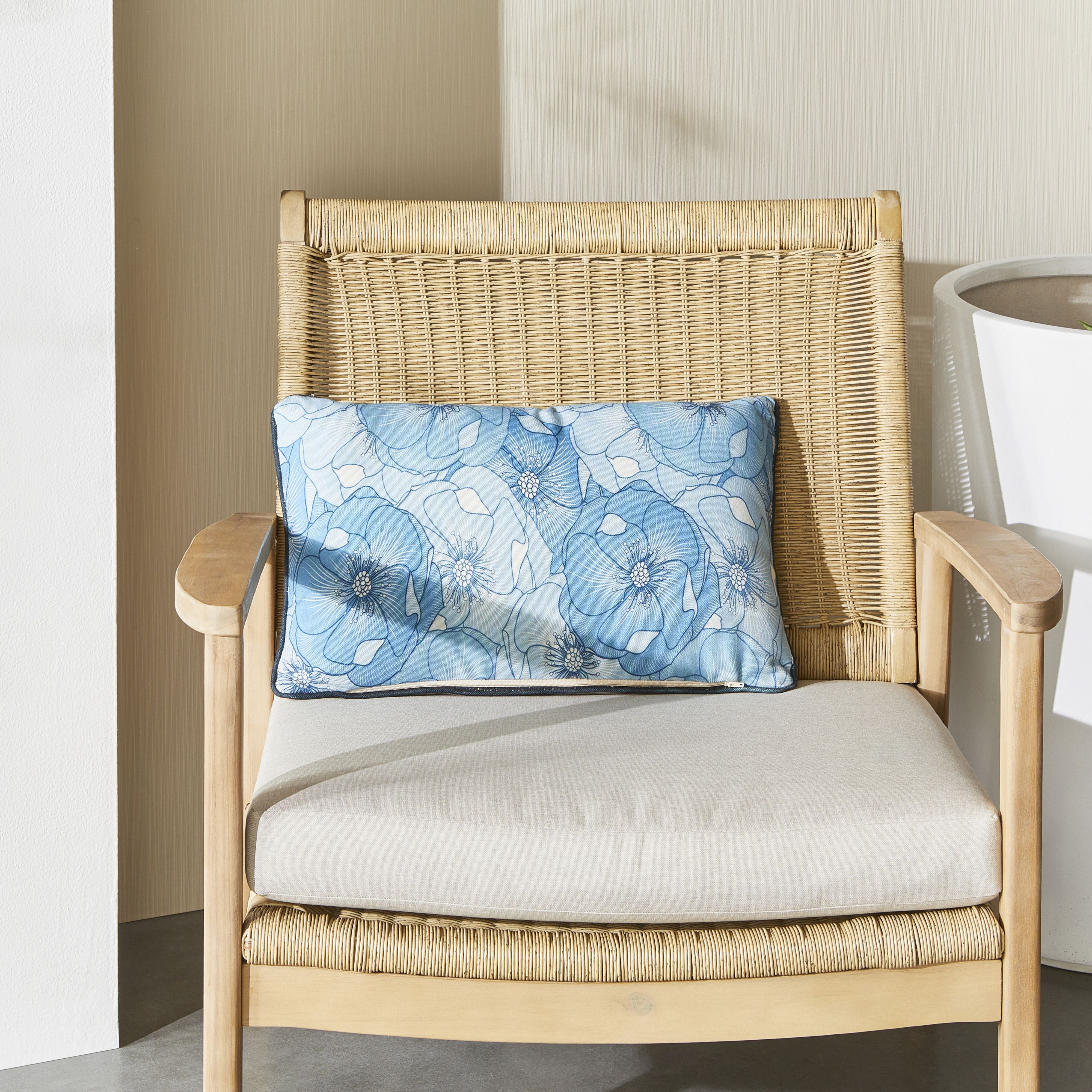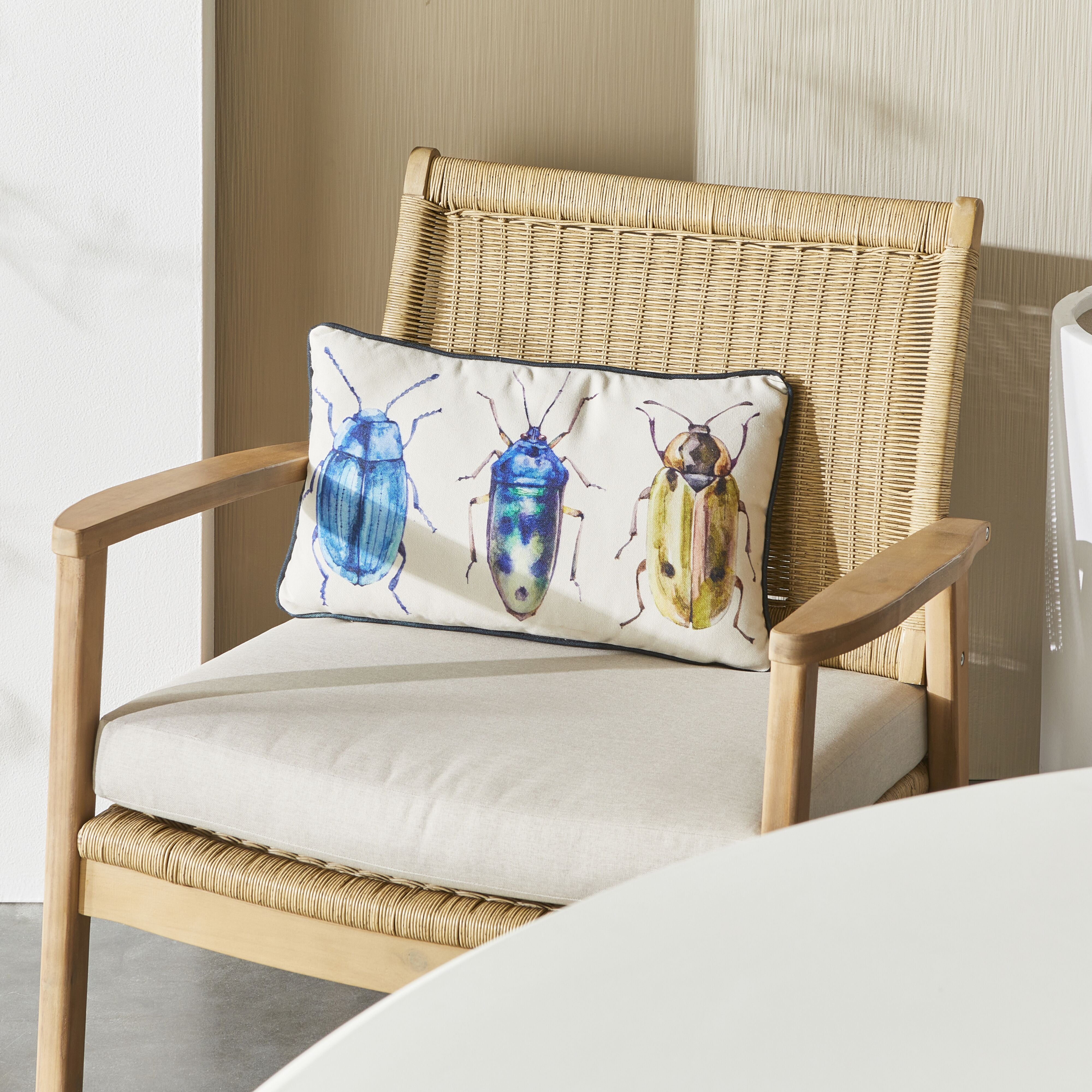 Bring a touch of whimsy to your space with the Aruba Outdoor Indoor Bugs Cushion, 50x30cm. Made from eco-friendly 100% recycled PET, this cushion features a reversible design for added versatility. One side showcases a Hamptons-inspired soft blue and white floral pattern, while the other side has a quirky Mid Century beetles design. Ideal for both indoor and outdoor use, this cushion offers a stylish and cost-effective way to refresh your décor.