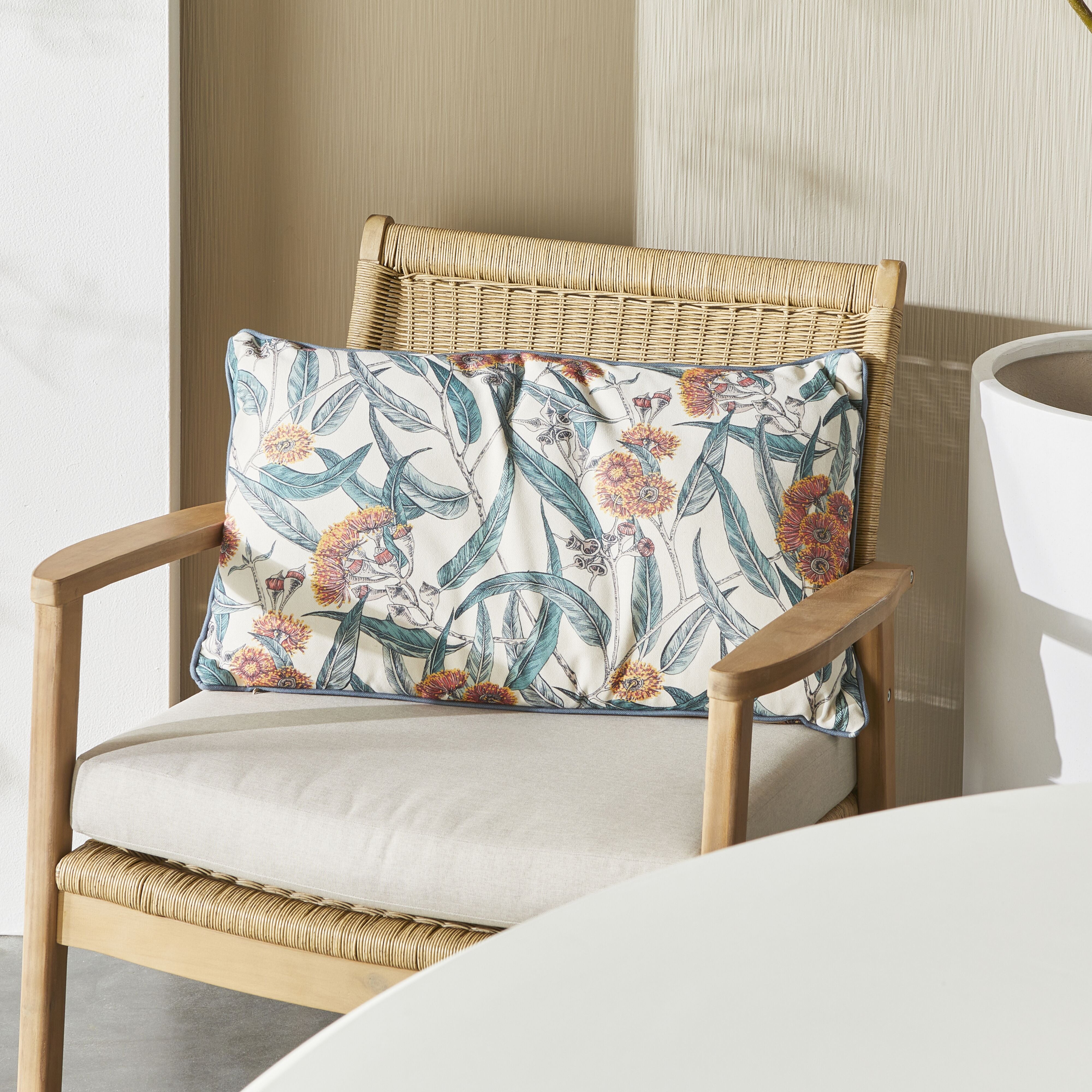 The Aruba Outdoor Indoor Orange Gum Nut Cushion 70x40cm is the perfect way to refresh your space with a burst of colour. Crafted from 100% recycled PET, this eco-friendly cushion features a reversible design. One side showcases a blue and yellow gum nut design with green leaves against a blue background, while the reverse offers the same design on a cream background. Ideal for both indoor and outdoor use, this cushion pairs beautifully with the Aruba Gum Nut Placemat to complete your setting.
