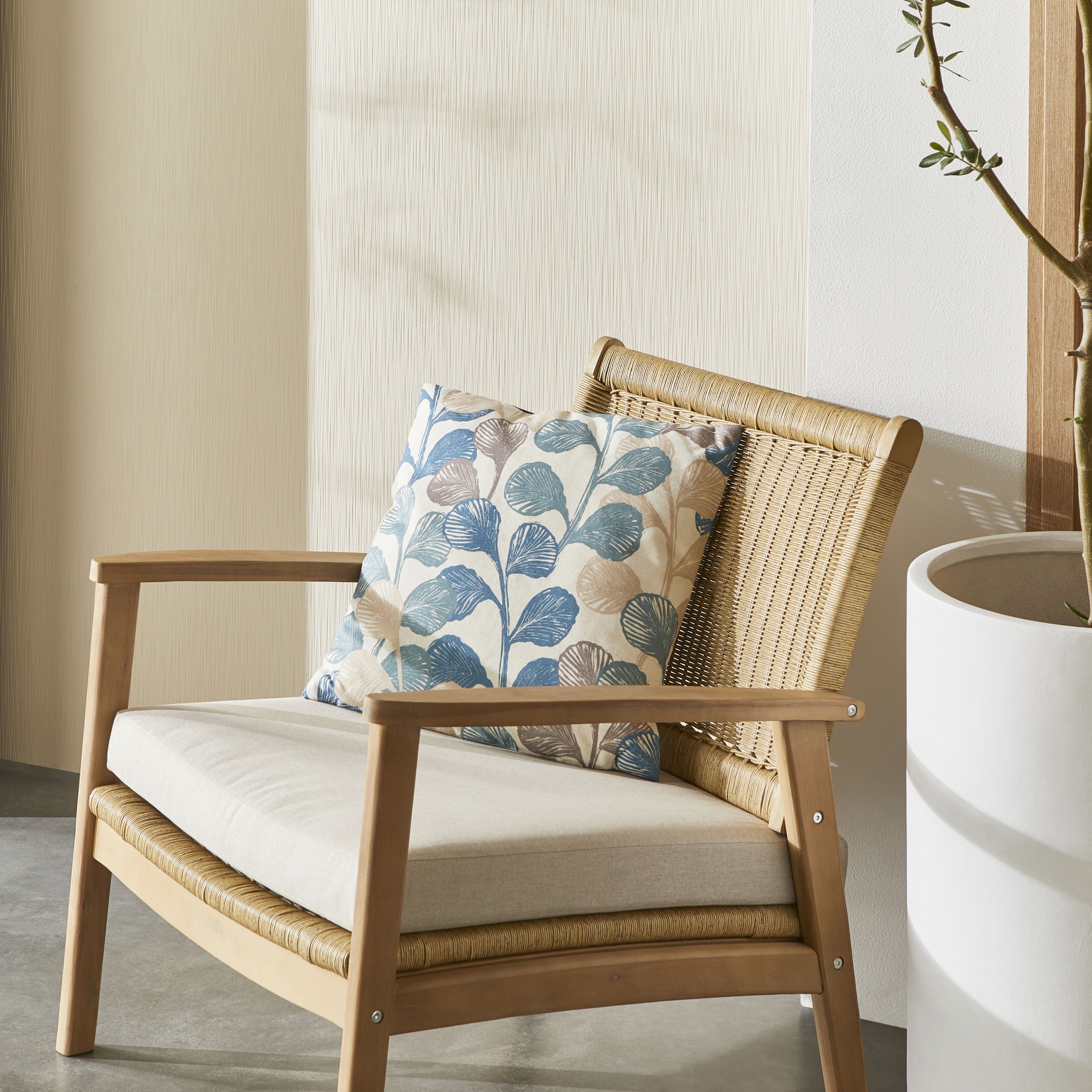Enhance your living space with the Aruba Outdoor Indoor Protea Night Garden Cushion 45x45cm. This reversible cushion features soft pastel colours in a leafy Hamptons-inspired pattern on one side and a Mid-Century autumn floral design on a navy background on the other. Perfect for both indoor and outdoor use, it's made from eco-friendly 100% recycled PET, making it a stylish and sustainable choice. Pair it with the Aruba Linea Flower Cushion for a coordinated look.