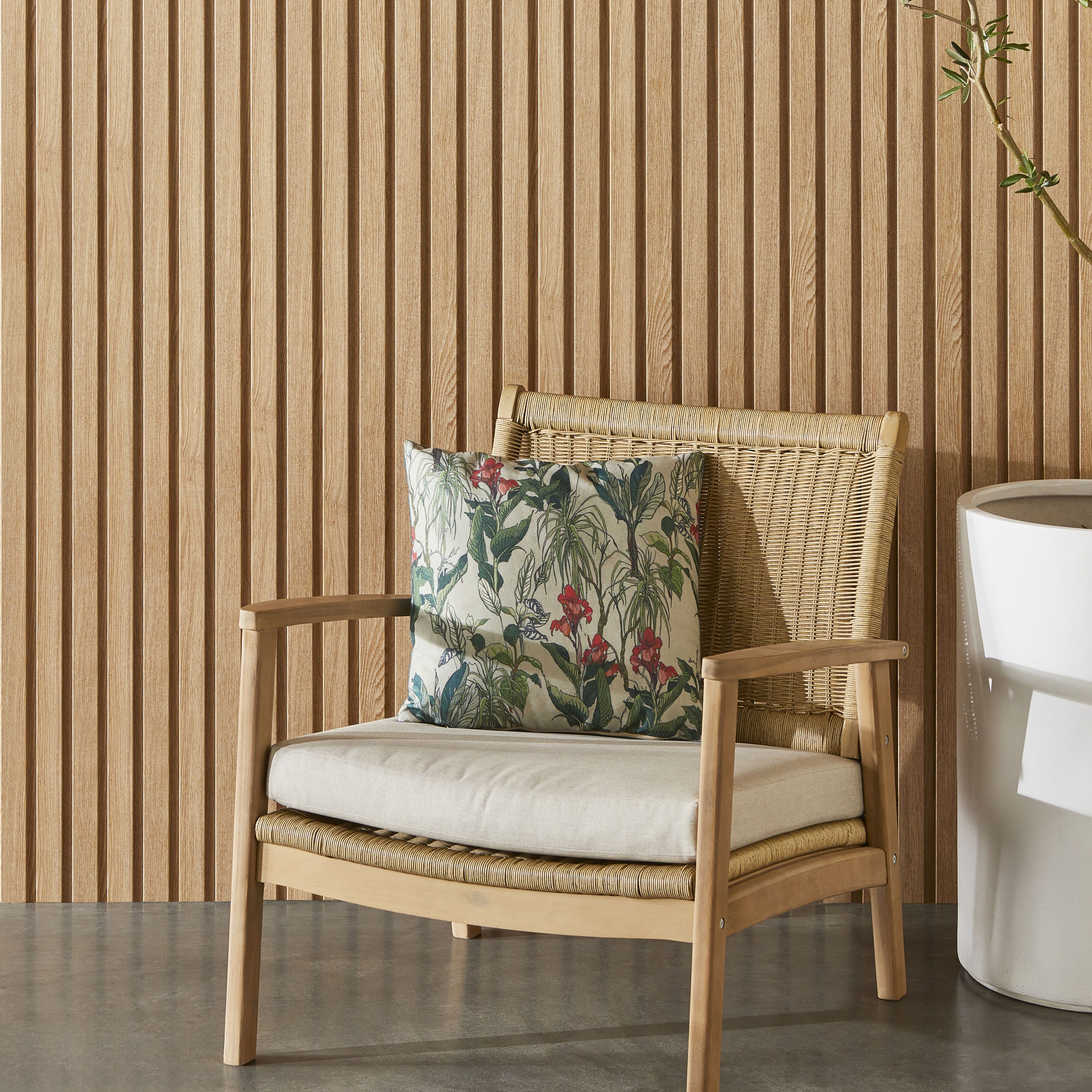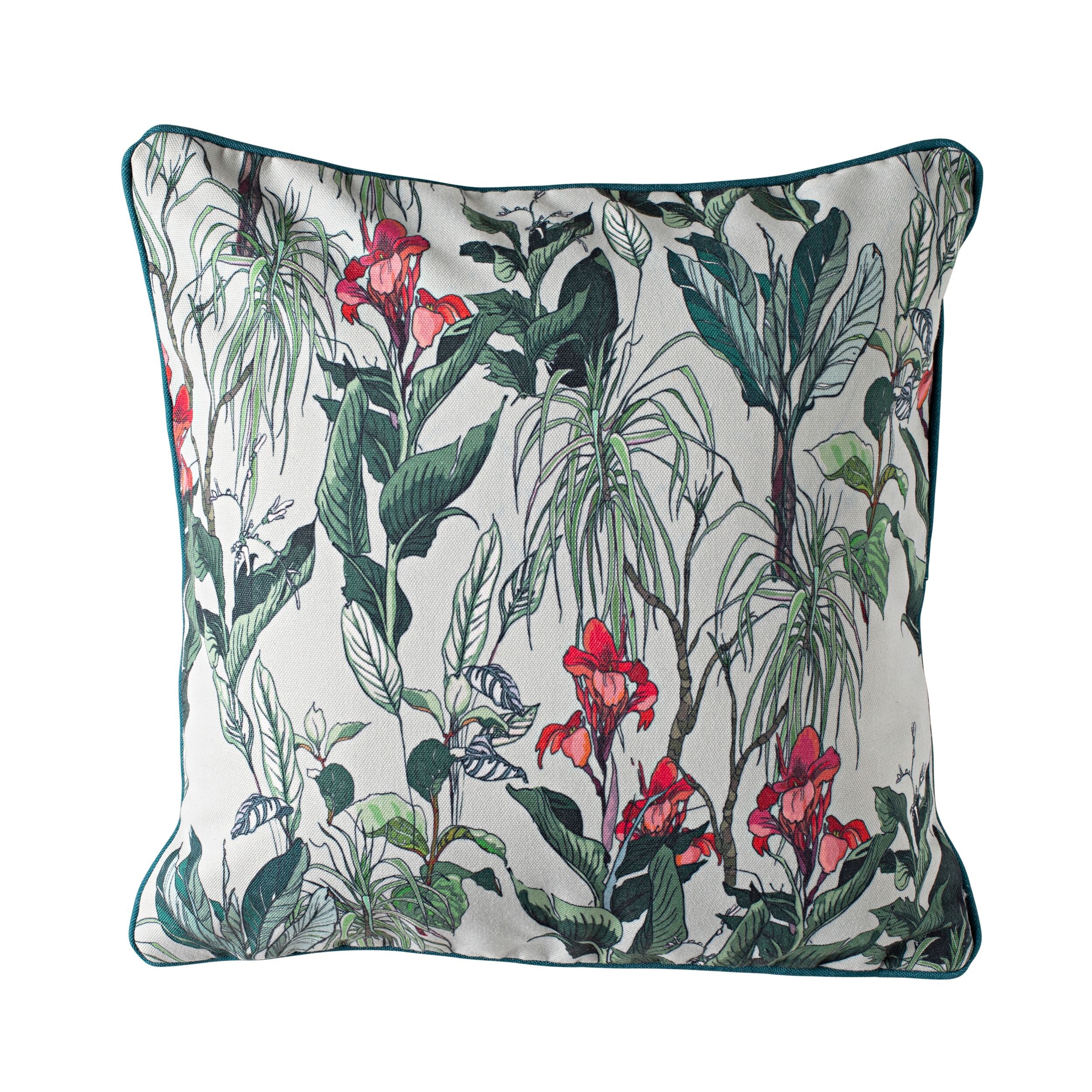The Aruba Outdoor Indoor Tropical Leaf Cushion 45x45cm brings a vibrant, tropical vibe to your home. Made from eco-friendly 100% recycled PET, this cushion is perfect for both indoor and outdoor use. The reversible design features a stunning illustrated forest with standout pink flowers on one side, while the reverse side offers a solid emerald green. It's an easy and cost-effective way to refresh your space with bold colours and lush patterns.
