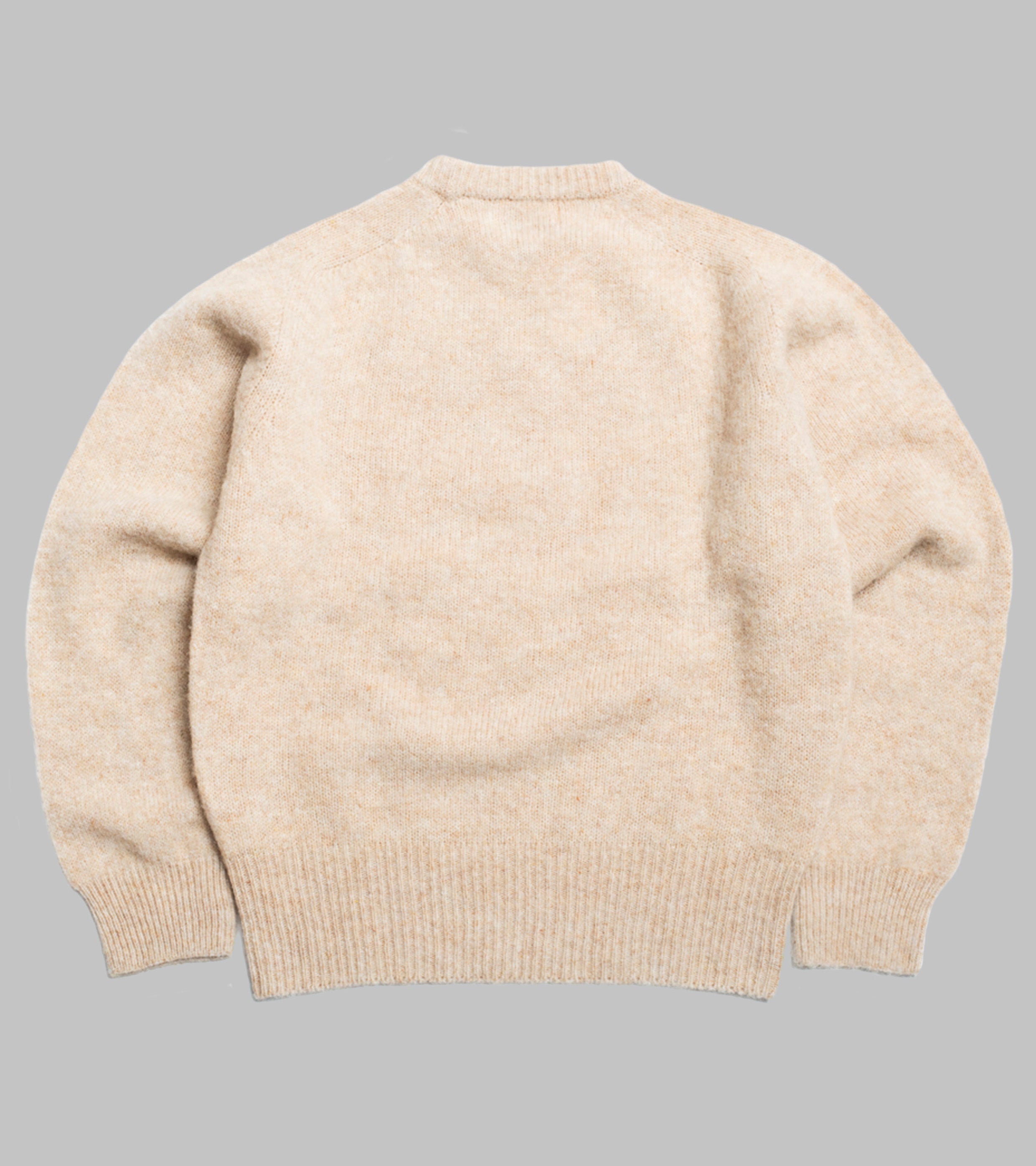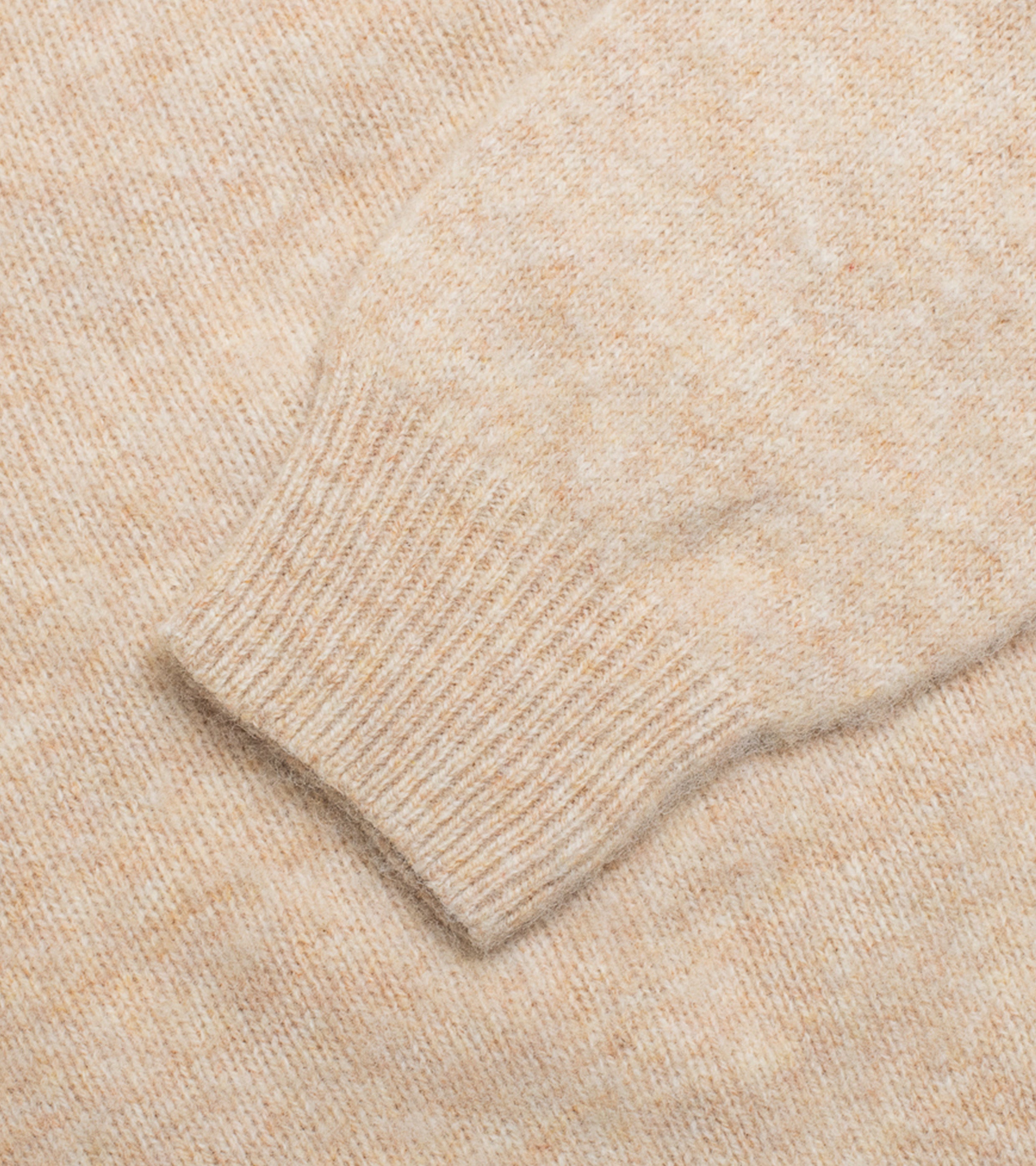 For us a brushed Shetland with its saddle shoulder and close sitting crew neck, is as applicable worn like a tee as it is a layering piece over Oxford cloth, as its shorter length allows. And knowing how well it tempers the most saturated of colours, we have lemon zest yellow, rosebud pink, cream and pecan to make the greyest of winter days a little more hopeful.